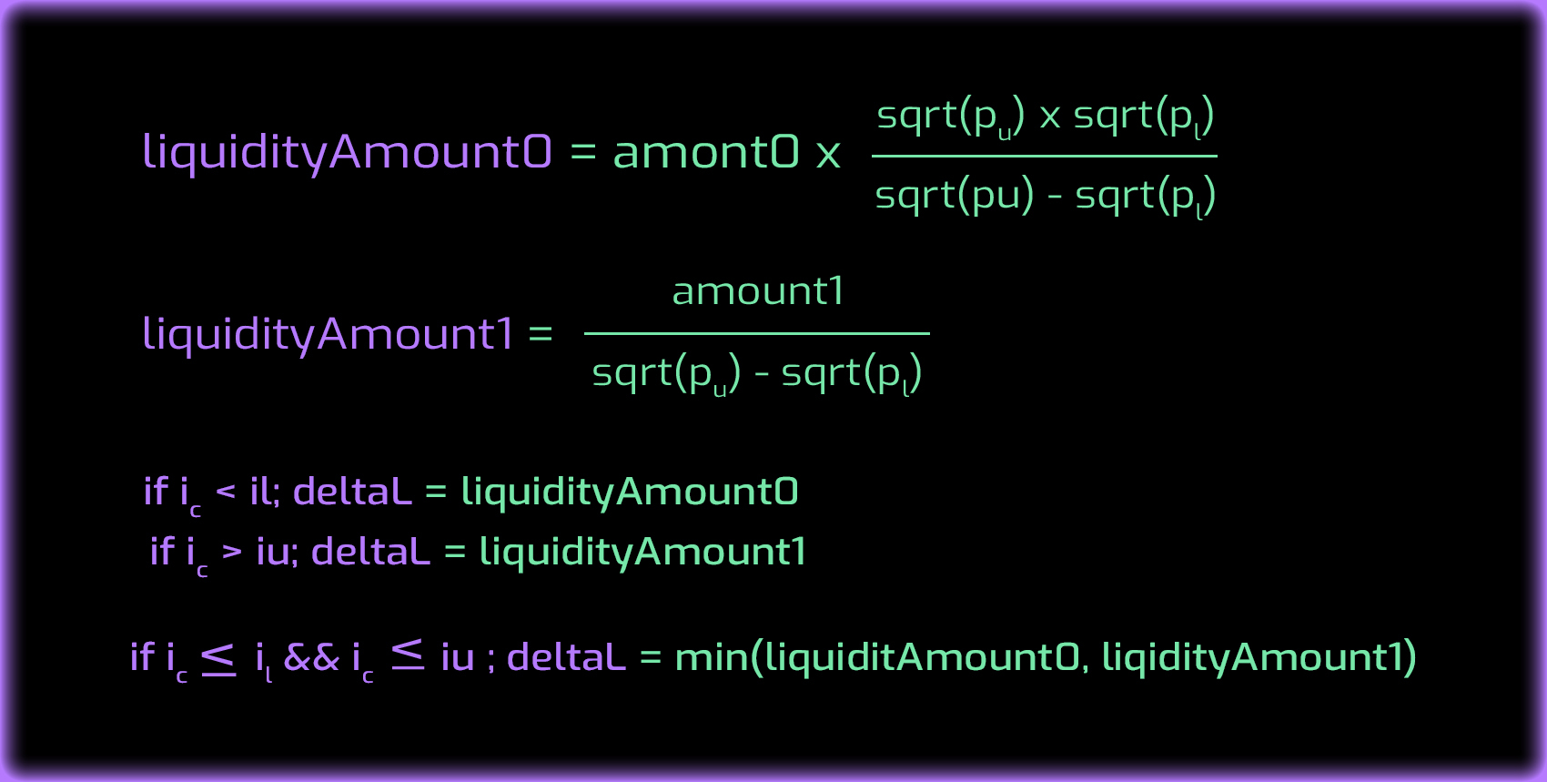 For estimation of the amounts of tokenA (*deltaX*) and tokenB (*deltaY*) we need to know *deltaL*: