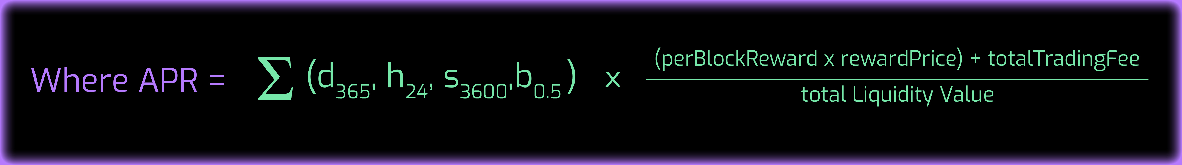 To calculate the overall Annual Percentage Rate (APR) for the pool, we make certain assumptions. We extrapolate trading fees and emissions per block to encompass all liquidity within the pool, including positions that fall outside the specified range.]