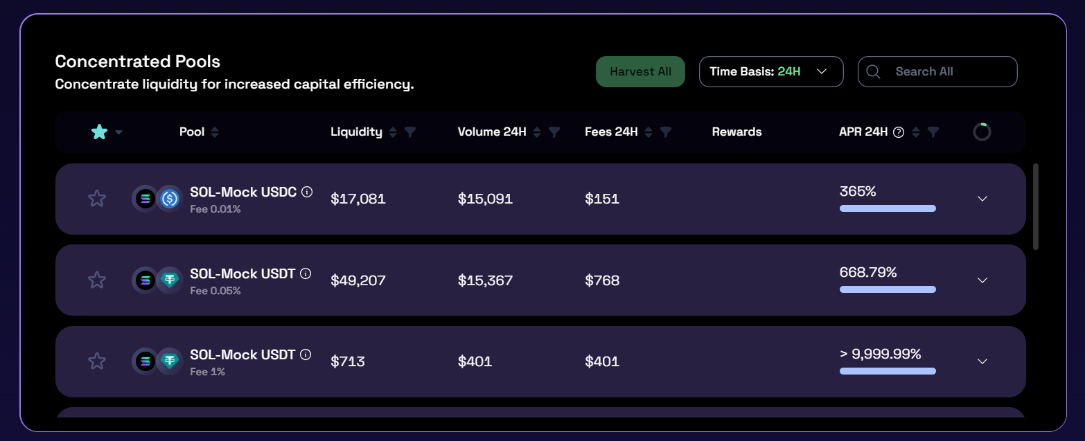 In a CLMM pool, if the price remains within a single tick, fees are distributed in proportion to the liquidity supplied by positions within that range. While it's possible to determine an accurate APR for a specific tick by considering the trading volume over a certain period, extending this calculation to all ticks across the pool and involving multiple liquidity providers becomes highly intricate. The conventional APR calculations used for constant product pools cannot be straightforwardly adapted for CLMM pools. Therefore, anticipated returns for CLMMs should be viewed as, at best, an estimation.